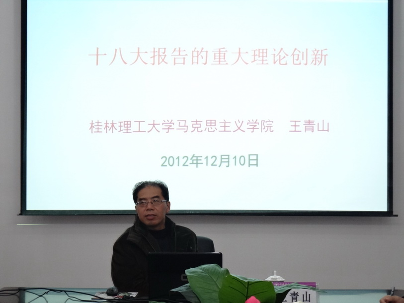 12月10日上午,为促进我院研究生深入学习贯彻党的十八大精神,学院党委书记、常务副院长王青山教授在雁山校区07415教室为我院全体研究生做了题为“十八大报告的重大理论创新”的报告。