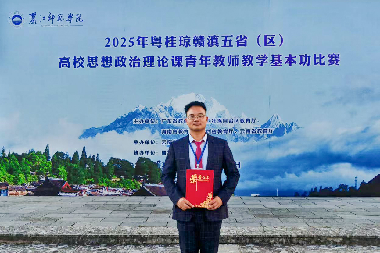 近日,2025年粤桂琼赣滇五省(区)高校思想政治理论课青年教师教学基本功比赛在丽江师范学院落下帷幕。我校suncitygroup太阳集团教师梁新堂以扎实的理论储备、创新的教学设计及优异的现场发挥,在本科组比拼中斩获三等奖,充分彰显了我校青年思政课教师的卓越素质与教学风范,这亦是我校首次在该类竞赛中取得突破。