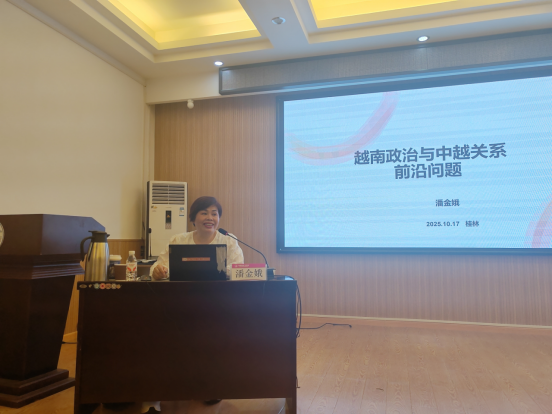 潘金娥教授主要围绕越南国情、政治体制、革新进程及中越关系发展等前沿议题展开深入讲解。她系统介绍了越南的基本国情、政治权力结构特征,重点分析了近年来越南新一轮改革动向,尤其是行政机构精简、党政关系调整及“民族崛起新纪元”战略目标。她还结合历史与现实,回顾了中越两党两国从革命时期“同志加兄弟”的深厚情谊,到新时代构建具有战略意义的中越命运共同体的历史进程,强调了两国在经贸、基建、人文等领域的务实合作与未来潜力。